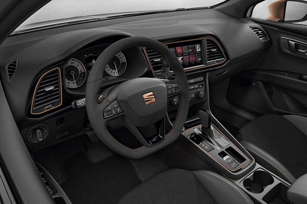 A l'intérieur, différents liserés et surpiqûres de couleur cuivre viennent s'accorder avec l'harmonie extérieure. Les sièges baquets en Alcantara® sont ici de série (option à 1 185 € sur la Cupra) alors que le volant le pommeau du levier de vitesse sont recouverts de la même matière. Des sympathiques fonds de compteurs blancs viennent compléter la panoplie alors qu'ne plaque numérotée vous signale que vous êtes bien au volant d'une série limitée.